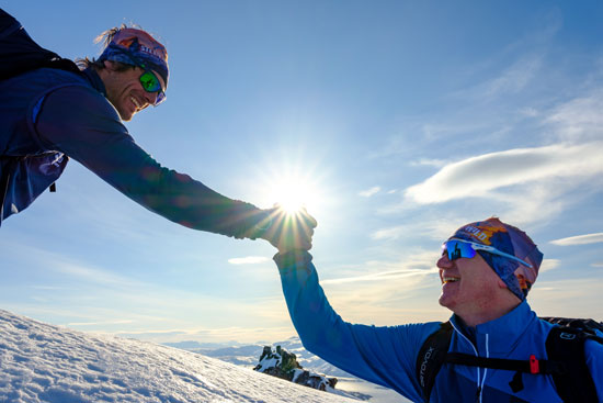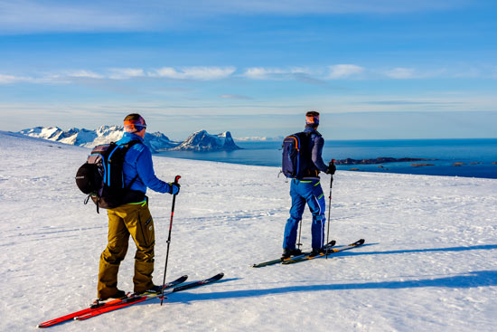Nach einer erholsamen Nacht starten wir nach dem Frühstück mit einer ersten Tour zum Husfjellet und dem Litjebrunsen, bei der wir uns einen guten Überblick über die vorherrschenden Verhältnisse verschaffen und erste Eindrücke der vielen Möglichkeiten bekommen, die uns diese Woche in Senja erwarten. Das umliegende Gebirge und die blauen Fjorde erfüllen uns mit Vorfreude auf die nächsten Tage. Wir sind schon jetzt gefangen in der malerischen und unglaublich schönen Region.