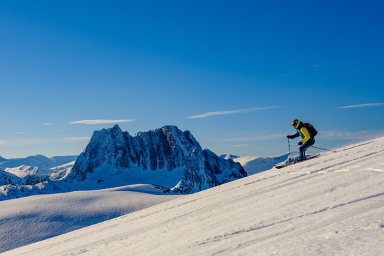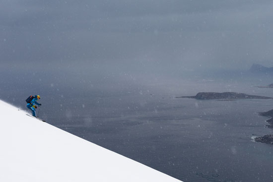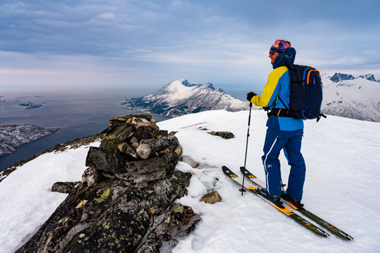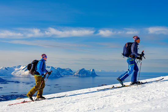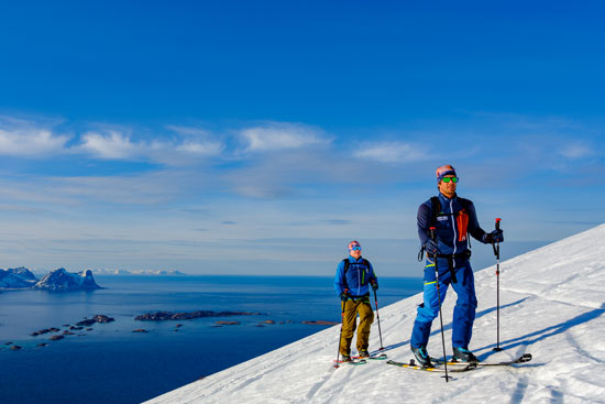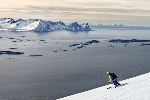 Heute geht es auf den Keipen, welcher einer der höchsten Berge auf Senja ist. Er lässt mit seinen perfekt geneigten Hängen, der traumhaften Aussicht auf die dunklen Fjorde und der offenen See unser Abfahrtsherz höher schlagen. Weiter steigen wir hinauf zum Gytetippen, der uns nochmals einen unvergleichlichen Ausblick über die Inselwelt von Senja bietet.