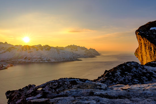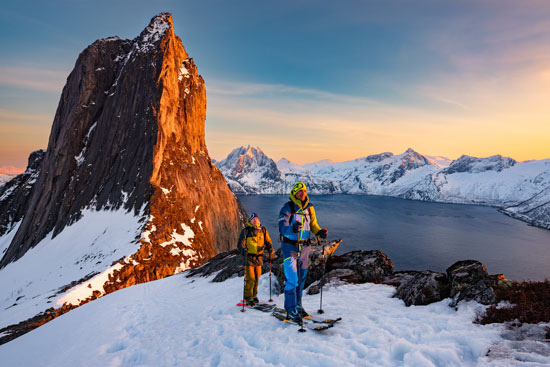 Heute können wir wählen, eine sehr einsame Skitour auf dem Kyle, die perfektes Skigelände bietet oder eines der anderen zahllosen Ziele auf Senja. Egal, wir werden wieder sehr eindrückliche und besondere Augenblicke erleben, die uns dieser Ort verschafft. Es ist einfach magisch, hier unterwegs zu sein. Heute können wir auch zum Sonnenuntergang in die Scharte des Segla, einem steilen Felszahn, aufsteigen und das Schauspiel der untergehenden Sonne direkt über dem Fjord beobachten und zusehen, wie diese Welt in goldenes Licht getaucht wird.